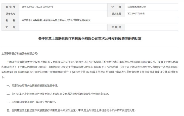 雷峰网消息,7月19日,证监会官网发布批复文件,同意上海联影医疗科创板首次公开发行股票的注册申请。